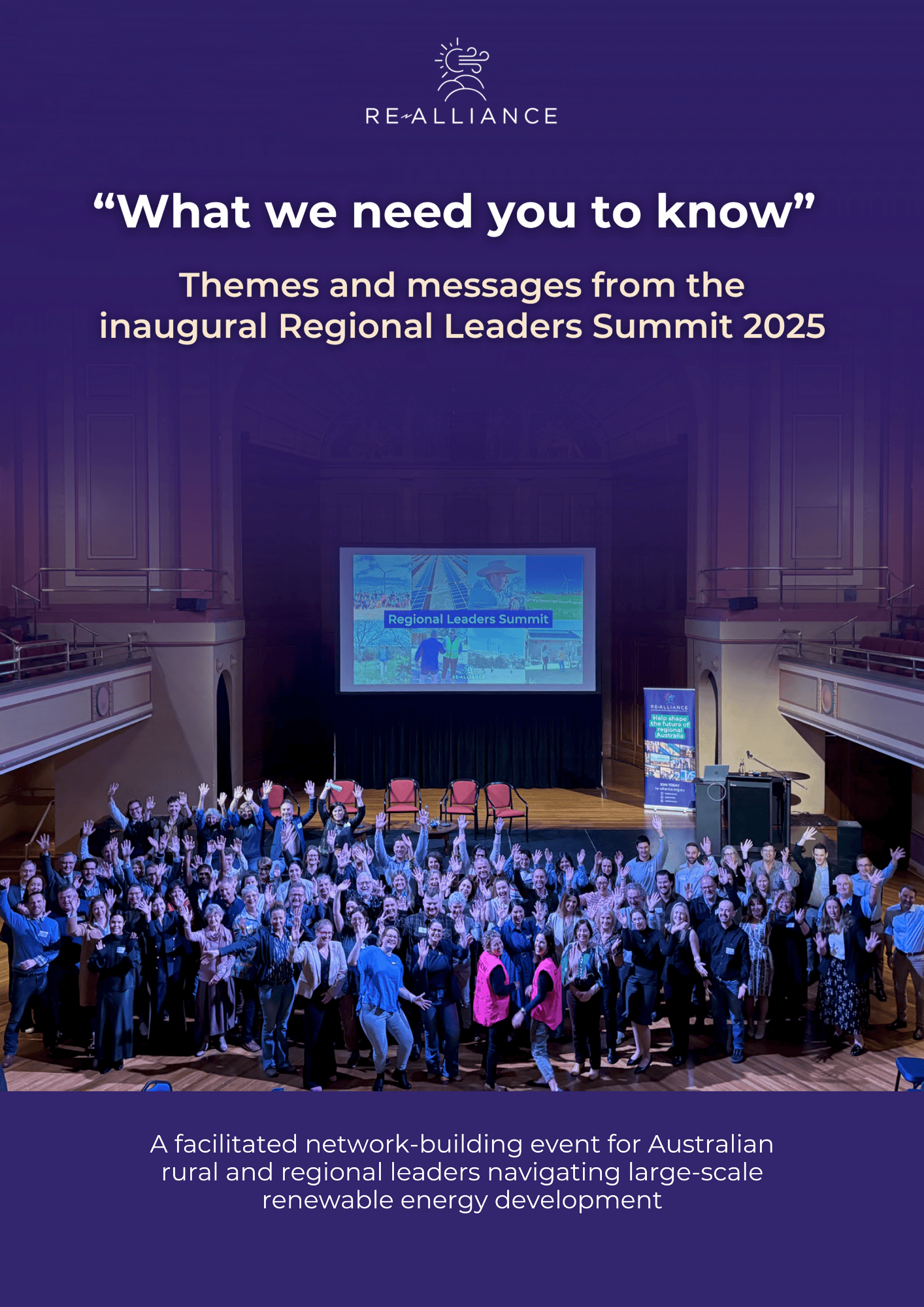 This report shares the key themes and messages from the inaugural Regional Leaders Summit. The Summit brought together more than 90 rural and regional leaders working in or alongside local government, regional development and community organisations. They gathered in Newcastle NSW in August 2025, and over two days they connected with each other, and shared stories, lessons and experiences as they work at the local level to maximise opportunities and reduce risk in the shift to renewable energy.